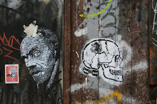 Scaaaaaaaaaaaary man head on the left. And yes, it's actually graffiti, not a sticker.